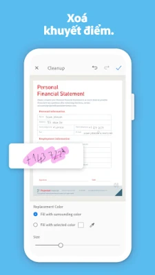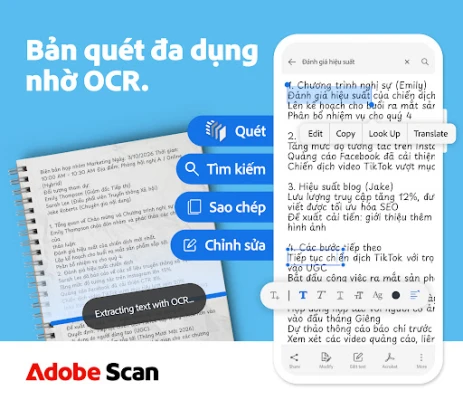 Đừng bỏ lỡ sức mạnh của công nghệ OCR (Nhận dạng ký tự quang học) tích hợp sẵn, cho phép Adobe Scan biến văn bản trong hình ảnh thành nội dung có thể tìm kiếm và chỉnh sửa. Dù là tài liệu in, ghi chú viết tay, danh thiếp hay bảng trắng, bạn có thể quét mọi thứ một cách nhanh chóng và chính xác. Ứng dụng còn cung cấp bộ công cụ chỉnh sửa toàn diện để bạn dễ dàng cắt, xoay, điều chỉnh màu sắc, độ sáng, độ tương phản và thậm chí loại bỏ vết bẩn hay nếp gấp, đảm bảo mỗi bản quét đều đạt chất lượng tối ưu.